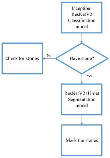 In this study, we proposed a computer-aided diagnostic system consisting of two subsystems. The overall system architecture is illustrated in Figure 17. Subsystem 1 is a urinary stone classification model based on Inception-ResNetV2, which is shown in Figure 18. Subsystem 2 is a urinary-stone segmentation model based on U-Net, which is illustrated in Figure 19. The system first generated a mask to remove the spine and pelvis from the KUB images and then performed limited-contrast AHE on the images. The kidney area was approximately segmented according to the mask, and 100 × 100-pixel stone images were cropped. The dataset was divided into training and testing sets in the ratio of 8:2, and data augmentation was employed by the classification model to simulate the diversity of stone images. After training the Inception-ResNetV2 classification model, the system was evaluated using several metrics, including sensitivity, specificity, precision, and F1-measure. The architecture of the semantic segmentation model was similar to that of the classification model, except for the data augmentation component and inclusion of three additional evaluation metrics for the mask: IoU, MIoU, and FWIoU. The complete system flow for visualizing KUB images is shown in Figure 20. The flowchart of the computer-aided diagnostic system is depicted in Figure 21.