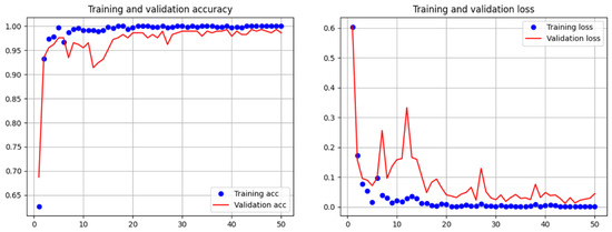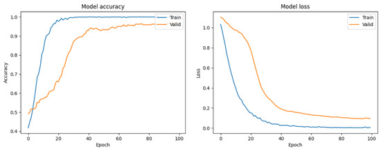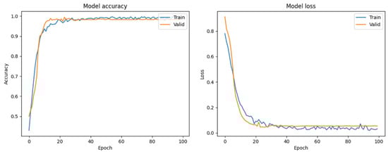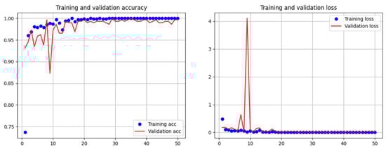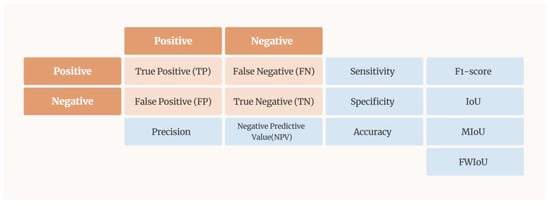 In addition to determining the model’s accuracy, we used seven other metrics, four of which were used to evaluate the classification and semantic segmentation models: sensitivity, specificity, precision, and F1-measure. The other three metrics, IoU, MIoU, and FWIoU, were used to evaluate the quality of the predicted masks of the semantic segmentation model. The formula for sensitivity is as follows: