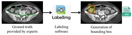 We obtained ground-truth information from the doctors’ annotations of the ROIs using Horos. However, to automatize the colorectal lesion localization method using AI, the machine must be trained to learn and make predictions based on correlations. This training can be achieved via collecting and feeding the data to the training models. However, in the case of supervised learning-based deep learning analysis, it is essential to annotate the data to provide labels for the machine’s training. As a result, we used the ground truths provided by the experts as a reference for generating the bounding box using LabelImg [