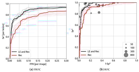 The ensemble model’s AUFROC (0.3) for cancer detection, presented in Figure 1a, is 0.733 (red curve) and 0.853 (black curve) for REC only and the LE and REC coupling, respectively.