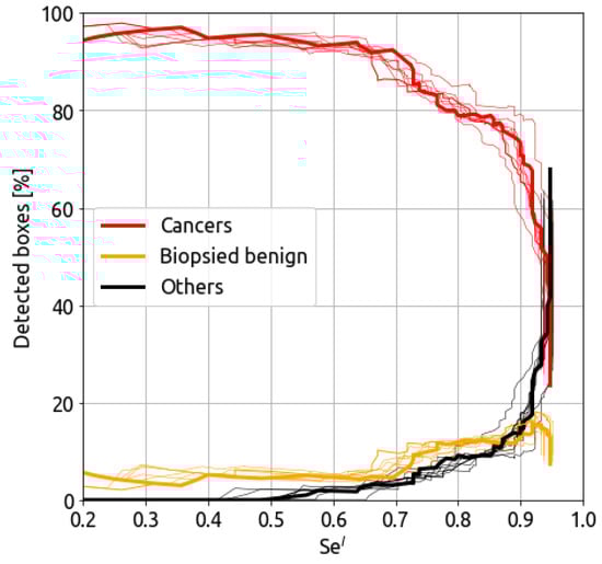 Ground-truth probability for the detected cancer boxes with respect to the cancer detection sensitivity Se. The thin lines represent individual models, whereas the ensemble model performance is represented in thick lines.