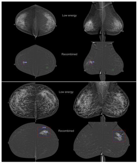 Finally, the current algorithm is applied to each image independently without considering the whole exam information. The recent development of multi-view CAD in FFDM has demonstrated significant improvements in results, from a simple average of the outputs [] to more complex multi-view architectures [] leveraging the consistency in texture and lesion characteristics between the CC/MLO and L/R views. Exploring this consistency in contrast-enhanced mammography (CEM) will help to reduce false positives.