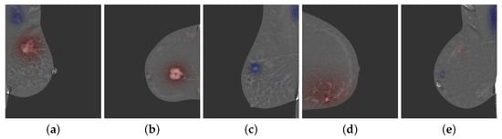 Detection heatmap for different images. Red areas (in (a,b,d)) represents high probability of cancer, while blue areas (in (a,c,e)) represent high probability of benign finding.