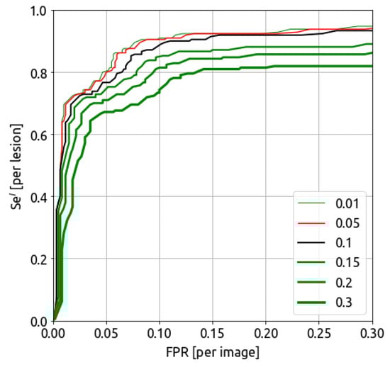 The IoU threshold plays an important role in assessing if a detected area is correctly located or not. Figure 5 shows the FROC curves at different IoU thresholds. With a higher acceptance threshold, the sensitivity at the lesion level decreases. The AUFROC (0.3) for an IoU threshold of [0.01, 0.05, 0.1, 0.15, 0.2, 0.3] are [0.874, 0.871, 0.853, 0.814, 0.779, 0.726], respectively. Two curves are highlighted, with an IoU threshold of 0.05 (red curve) and 0.1 (plain black curve). At an IoU threshold of 0.1, the mean IoU of the detected lesion is high (around 0.44); hence, the lesion surfaces are well detected. This corresponds to, for example, large, clearly malignant contrast uptakes.
