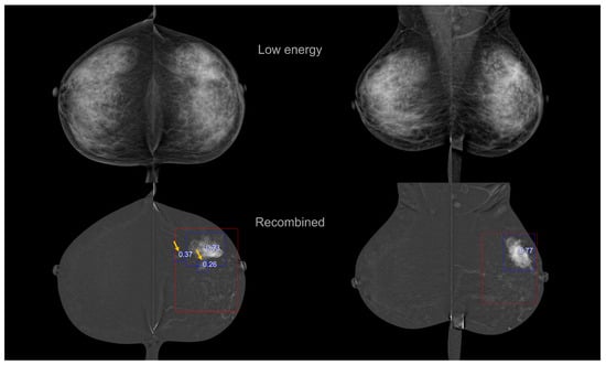 Already developed in the field of contrast-enhanced MRI [,], its application to CEM has only recently been explored in the literature. Existing studies in this area have used various state-of-the-art DL architectures for detection and segmentation tasks, but they have been limited by small datasets. In their paper [], Khaled et al. used a Mask-RCNN [] architecture to detect and segment breast lesions based on a dataset of 326 patients. In a previous study [], a detection algorithm was applied for the detection of lesions (benign and malignant) from a dataset of 536 patients. A major limitation of the two previous studies is the small number of patients in the dataset. In a recent publication from Zheng et al. [], 1912 Asian patients where enrolled in a DL segmentation and classification study based on a Faster-RCNN [] architecture. With promising results, this work excluded the presence of multiple, bilateral, and non-mass lesions and lesions seen only in one view that may represent complex cases. The evaluation of the impact of the image inputs and performance regarding breast clinical factors such as background parenchymal enhancement was not explored. Based on the segmentation of lesions, a complementary analysis of this study is to evaluate lesion detection metrics (e.g., number of false positive).