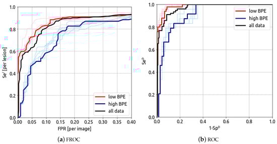 The FROC and ROC curves for low (104 cases, 437 images) and high (46 cases, 197 images) BPE levels are presented in Figure 6. The model’s AUFROC(0.3) for cancer detection is 0.891 (red curve) and 0.712 (blue curve) for low and high BPE, respectively. The AUROC for breast classification is 0.986 (0.976–0.995) (red curve) and 0.919 (0.866–0.962) (blue curve) for low and high BPE, respectively. These results show that the algorithm’s performance is lower for high BPE compared to low BPE.