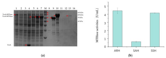 E. coli BL21 (DE3) TrxB and pET32a were used for gene expressions of MTSase and MTHase to construct recombinant E. coli strains. B. subtilis SCK6 and plasmids pMC68 and pHT43 were used for gene expressions of MTSase and MTHase to construct recombinant B. subtilis strains, respectively. All of the strains and plasmids used in this study are listed in Table S1 of the Supplementary Materials. Moreover, all of the primers designed in this study are listed in Table S2.