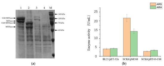 We use the fusion expression tag CBM68, which was developed in our previous study [], to enhance the secretory expressions of ARS and ARH. To our delight, the recombinant ARS and ARH were detected in the medium after the fermentations of the recombinant B. subtilis strains with a high-copy plasmid pMC68 and a low-copy plasmid pHT43-C68, respectively (Figure 2a). Similarly to our previous results [], both the CBM68 fused enzymes and the untagged enzymes were found in the fermentation medium (Figure 2a). The extracellular activities of the recombinant enzymes showed that the CBM68 fused recombinant ARS and ARH with pMC68 plasmid had relatively higher activities by 21.6 U/mL and 14.1 U/mL, which were 5.17 and 3.19 times higher than those of the recombinant ARS and ARH expressed in E.coli, correspondingly (Figure 2b). The relatively lower activities of the CBM68 fused recombinant ARS and ARH in pHT43 plasmids were properly caused by lower protein expression amounts (Figure 2). Meanwhile, these results proved that CBM68 indeed played a significant role in increasing the expression of foreign proteins in B. subtilis once again. Therefore, we selected the CBM68 fused recombinant ARS and ARH for the construction of further expression strains in B. subtilis.