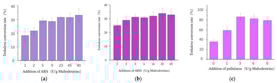 Effect of different enzyme additions on trehalose conversion rate. (a) The optimum additional amount of ARS for trehalose production. (b) The optimum additional amount of ARH for trehalose production. (c) The optimum additional amount of PulA for trehalose production. All values are expressed as the means ± SDs (n = 3).