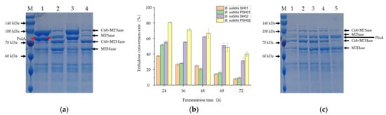 For the co-expression of the three enzymes, the PulA encoding gene was inserted at the amyE site of the genome of B. subtilis SCK6, while the ARS and ARH encoding genes were co-expressed using plasmids pMC68 or pHT43-C68, respectively. Four recombinant strains were successfully constructed to determine the extracellular expression of each target protein and the trehalose conversion rates catalyzed by the extracellular multi-enzymes produced by different strains: B. subtilis PSH01 (amyE::pulA/pMC68-ARS/pHT43-C68-ARH), B. subtilis SH01 (pMC68-ARS/pHT43-C68-ARH), B. subtilis PSH02 (amyE::pulA/pHT43-C68-ARS/pMC68-ARH), and B. subtilis SH02 (pHT43-C68- ARS/pMC68-ARH). The results were shown in Figure 4 and Figure S2. Although the strains B. subtilis PSH01 and B. subtilis SH01 showed relatively higher expression amounts of ARS after 48 h of fermentation using the high copy number plasmid pMC68 (Figure 4a), the strains B. subtilis PSH02 and B. subtilis SH02 showed relatively higher trehalose conversion rates at different fermentation times (Figure 4b). However, because ARH was expressed using pMC68 in the recombinant strains B. subtilis PSH02 and B. subtilis SH02, the ARH expression levels of B. subtilis PSH02 and B. subtilis SH02 showed relatively higher rates than those of B. subtilis PSH01 and B. subtilis SH01 (Figure 4a). It indicated that the over-expression of ARH in the system, when a single strain was used to produce multiple enzymes, was relatively important for the improvement of the trehalose conversion rate. Moreover, when compared with B. subtilis SH02, the trehalose conversion rate in B. subtilis PSH02 was 1.45 times higher catalyzed by its extracellular multi-enzymes after 24 h fermentation (Figure 4b and Figure S2). It was concluded that the co-expression of PulA in the multi-enzyme expression system played a significant role in improving the trehalose conversion rate. As shown in Figure 4b, the effects of different fermentation times of the four recombinant strains on the trehalose conversion rates were evaluated. According to the results, B. subtilis PSH02 could reach the highest trehalose conversion rate after 24 h fermentation, while B. subtilis SH02 needed 48 h of fermentation to reach its highest trehalose conversion rate (Figure 4b). Moreover, the highest trehalose conversion rate by B. subtilis PSH02 was up to 80%, which was 1.29 times higher than that of B. subtilis SH02 (Figure 4b). However, with the extension of fermentation time, the trehalose conversion rates in B. subtilis PSH02 declined gradually, which was contrary to the increases in the extracellular expressions of target proteins (Figure 4b,c). As the cells grew and plasmids replications, the ARH was expressed and accumulated into a high but unmatched amount to the ARS and substrate, which led to the hydrolysis of the substrate and the reduced trehalose conversion rate accordingly (Figure S3). This unconventional hydrolysis was also proved by the partial increase in trehalose yielding during the determinations of the PulA lacking strain SH02, as shown in Figure 4b. ARH caused the hydrolysis of some α-1,4-glycosidic bonds of maltodextrin, and more reducing ends were revealed to be new substrates, increasing the trehalose production temporarily. With the prolongation of the fermentation time, this enhancement was limited due to the unmatched expression level of ARS and ARH, which caused the decreasing trend of trehalose production ultimately. It indicated that compared with increasing the expression level of each target protein, keeping the appropriate ratios of the three enzymes was more important for enhancing the trehalose conversion rate catalyzed via this multi-enzymatic system produced using one-step fermentation. As shown in Figure 4, at the fermentation time of 24 h, B. subtilis PSH02, producing the optimum ratios of ARS, ARH, and PulA in the extracellular medium made the trehalose conversion rate up to 80% from 10 g/L maltodextrin during 48 h of reaction at 50 °C.