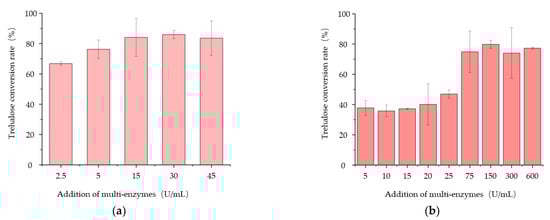 Effects of different addition dosages of multi-enzymes on the trehalose conversion rate at the maltodextrin substrate concentration of 10 g/L (a) and 100 g/L (b). All values are expressed as the means ± SDs (n = 3).