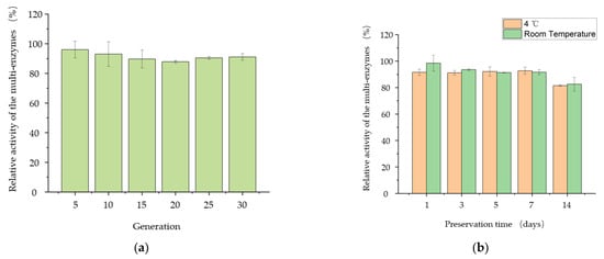 In order to further evaluate the production characteristics of B. subtilis PSH02, the passage stability of B. subtilis PSH02 and the stability of its extracellular multi-enzyme activity were determined in this work. As shown in Figure 6a, the relative activity of the extracellular multi-enzymes of B. subtilis PSH02 was higher than 88% after a successive passage to 30 generations. It indicated that B. subtilis PSH02 had a high production stability of the extracellular multi-enzymes. Moreover, both at 4 °C and room temperature (25–35 °C), the extracellular multi-enzymes could keep high relative activities during 7 days of preservation (Figure 6b). After 14 days of preservation at 4 °C and room temperature (25–35 °C), the relative activities of the extracellular multi-enzymes were 82% and 83%, respectively. Thus, the stabilities, both in B. subtilis PSH02 generations and its extracellular multi-enzymes activities, made B. subtilis PSH02 a potential industrial production strain.