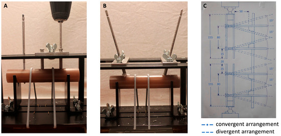 Cylinders loaded into customized jig allowing pin insertion in different pin flights: (A) perpendicular pin placement; (B) converging pin placement; and (C) drawing of the experimental setup as seen sagittally cut through the midsection of the construct. Note the center of rotation of the pins situated in the middle of the bone analog cylinders. The angulated pin arrangements are superimposed with dashed lines. Values in millimeters.