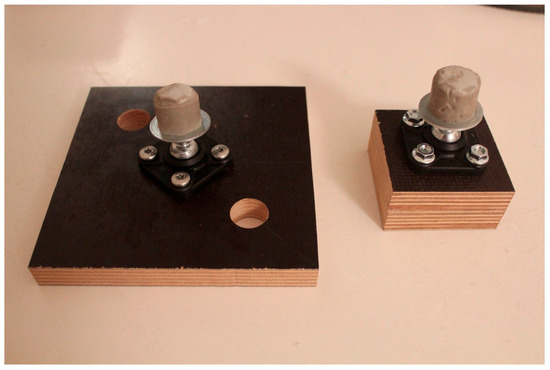 Reusable ball joints (Igubal Flanschlager, Igus GmbH, Cologne, Germany) screwed onto multiplex boards. Note the plaster adjusted to the inner diameter of the composite cylinders.