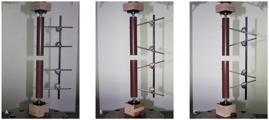 Representatives of the three different test groups loaded into the testing machine: (A) parallel pin configuration; (B) converging pin configuration; and (C) diverging pin configuration.