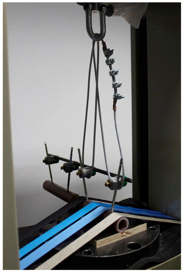 This was followed by a pull-out test of the pin pairs from the cylinder segments. For this purpose, a multiplex board with a cut-out was screwed to the base plate. Each cylinder was placed in the indentation and secured to the base plate with four tension straps, for a total of 18 specimens. A cable wire attached to the input platen was looped around the two corresponding fixator couplings before a tensile force was applied at a speed of 50 mm/min until construct failure (Figure 4). Force and distension were recorded.