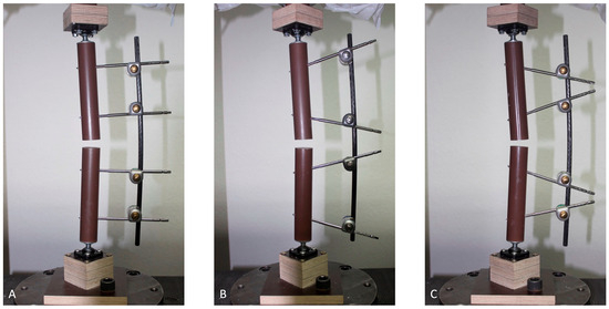 Cantilever bending of the fixator bar under axial load with 200 N: (A) parallel pin configuration; (B) converging pin configuration; and (C) diverging pin configuration.