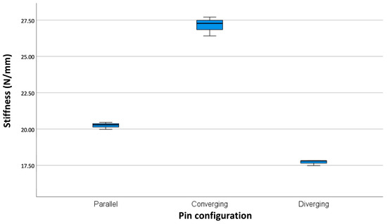 There was a significant difference in mean stiffness between the three groups, with the converging configuration being the stiffest (27.13 ± 0.67 N/mm) and the diverging configuration being the least stiff (17.71 ± 0.19 N/mm). The parallel mounting showed an intermediate stiffness (20.24 ± 0.24 N/mm). The results are shown in Table 1 and Figure 6.