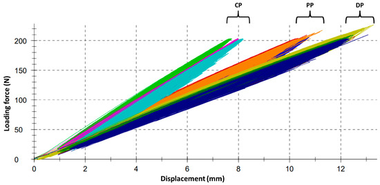 Load/displacement curves as recorded by the testing machine during multi-cycle dynamic axial load test with 4000 cycles. Note the grouping of the curves reflecting the difference in stability of the three pin configurations. Gross irregularities suggesting a loosening or damage of construct parts cannot be stated. CP = converging pins; PP = parallel pins; DP = diverging pins.