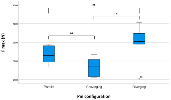 Box plot of the maximum force at failure during extraction of the pin pairs out of the bone analogs. S indicates significant difference (p-value < 0.05), ns indicates no significant difference, * ndicates an outlier.