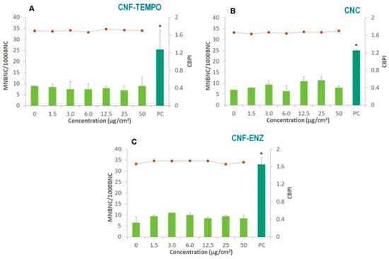 Results of the micronucleus assay in A549 cells co-cultured with THP-1 cells after exposure to (A) CNF-TEMPO; (B) CNC and (C) CNF-ENZ. Light green bars represent the frequency of micronucleated binucleated cells per 1000 binucleated cells (MNBNC/1000 BNC); the dotted line represents the cytokinesis-blocked proliferation index (CBPI). The dark green bar represents the frequency of MNBNC/1000 BNC for mitomycin C, used as the positive control (PC). Results are expressed as M ± SD. * p < 0.0001.