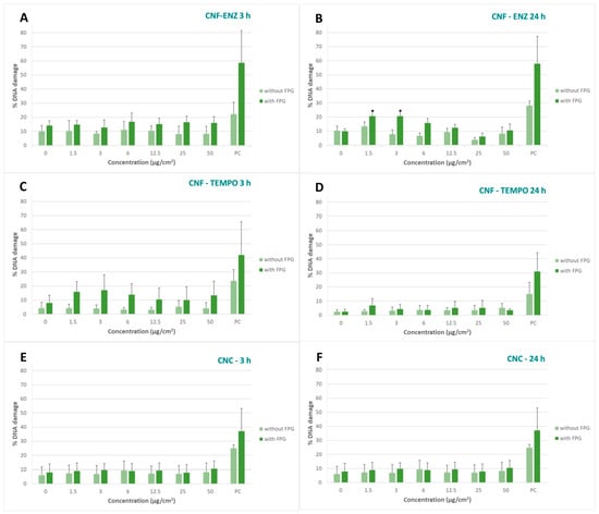 Results of the comet assay after 3 h and 24 h of exposure to (A,B) CNF-ENZ, (C,D) CNF-TEMPO and (E,F) CNC, respectively, in A549 cells co-cultured with THP-1 cells. Columns represent the percentage of DNA damage, lighter green without FPG and darker green with FPG. EMS was used as the positive control (PC). Results are expressed as M ± SD. * p < 0.05.