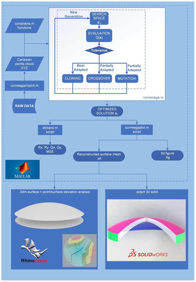 The corneal model reconstruction method proposed in this work is shown in Figure 1. Briefly, its procedure can be explained as follows: source data from the optical tomography are entered, after data conversion, into a script called “corneaga.m” run under Matlab software. The script uses ga function of the genetic algorithm to obtain the optimal parameters of the modal fit of the corneal surface to an implicit equation. Once the reconstruction parameters are obtained, the surface is graphically represented within the Matlab environment and can then be exported as a mesh. Additionally, the morpho-geometric parameters of the reconstructed cornea and the goodness of fit are obtained using their mean squared error (MSE). The obtained surface can be graphically represented and analyzed using CAD software such as Rhinoceros (version 7.0; McNeil Inc., NJ, USA) or Solidworks (version 2022; Dassault Systèmes, Vélizy-Villacoublay, France). In Figure 1 below, all the executed phases are shown in detail.