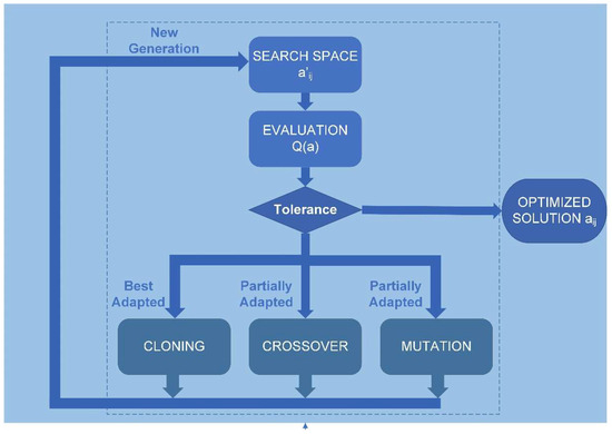 Genetic algorithm flowchart. aij: coefficients of the polynomial of the geometry of a quadric (Equation (2)). Q(a): adaptation function.