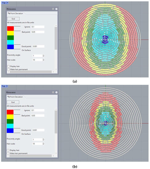 Example of point deviation analysis in Rhinoceros©, where the deviation in elevation between the experimental point cloud and the reconstructed surface is represented using a color scale for: (a) the CORNEAGA method (top) and (b) LSQ method (bottom). (Patient’s characteristics: healthy, age = 29, sex = male, eye = right, central thickness = 512 μm).