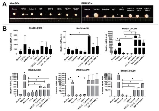 In this experiment, chondrogenic differentiation of MenSCs and BMMSCs was stimulated in a pellet model using TGF-β3, activin A, BMP-2, IGF-1, and their combinations (TGF-β3 + activin A, TGF-β3 + IGF-1, and TGF-β3 + BMP-2) for 21 days. After differentiation, pellets were evaluated by size and prepared for gene expression analysis, as discussed in the methods section (see Section 2.2 and Section 2.3) (Figure 1). No differences in MenSCs pellet size were observed after stimulation with different growth factors, with all pellets being a similarly round shape (Figure 1A). However, differences in BMMSCs pellet size have been observed, where the largest pellets formed after stimulation with TGF-β3 only. Combinations of TGF-β3 + activin A, TGF-β3 + IGF-1, and TGF-β3 + BMP-2 also resulted in a slightly larger size as compared to single activin A, BMP-2, and IGF-1 stimulation in BMMSCs (Figure 1A).