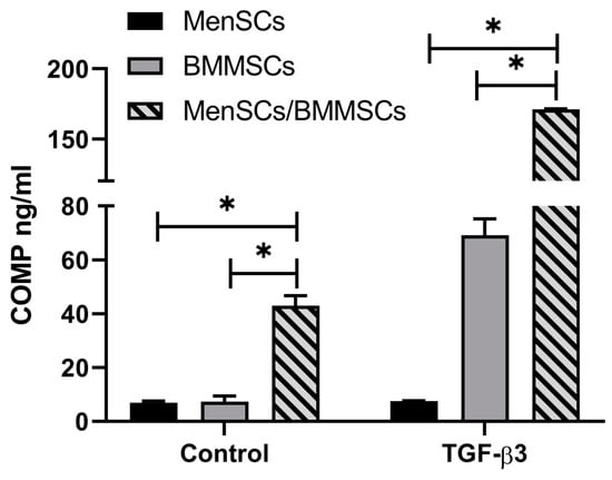 Levels of secreted COMP protein in the chondrogenic medium after 21 days of BMMSCs (n = 3) differentiation under co-culture conditions with MenSCs (n = 4) (using 0.4 μm inserts), without (Control) and with TGF-β3 (ELISA). Data are presented as mean ± SD. * Horizontal bars represent p ≤ 0.05.