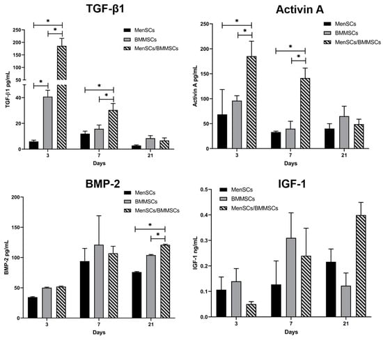 Levels of secreted TGF-β1, activin A, BMP-2, and IGF-1 after 3, 7, and 21 days of chondrogenic differentiation of BMMSCs (n = 3) in co-cultures with MenSCs (n = 4), using 0.4 μm inserts in chondrogenic medium without growth factors (ELISA). Data are presented as mean ± SD. * Horizontal bars represent p ≤ 0.05.