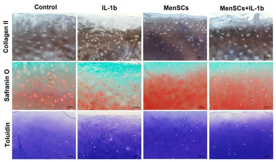 Human articular cartilage explants were co-cultured with MenSCs to evaluate MenSCs paracrine factor effects on cartilage tissue ECM under inflammatory conditions with IL-1β. For these purposes, cartilage explants were cultivated in 0.4 μm inserts for 21 days, with/without MenSCs seeded in 6-well plate wells with/without IL-1β (as discussed in Section 2.6). As expected, the integrity of cartilage explant ECM was impaired after stimulation with IL-1β as compared to control samples. This was observed according to histological and immunohistochemical analysis as the staining intensity of safranin O, toluidine blue, and collagen type II antibody labelling decreased (Figure 4). On the other hand, explants cultivated in co-cultures with MenSCs demonstrated intense staining with safranin O and toluidine blue, as well as collagen type II antibody labelling. However, the effect of IL-1β was also visible in co-culture conditions with MenSCs with slightly reduced ECM staining, as compared to unstimulated with IL-1β co-cultures (Figure 4).