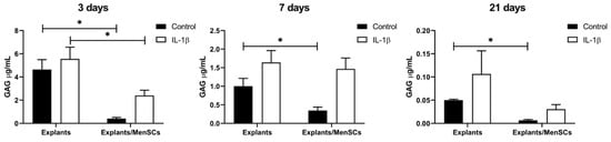 Glycosaminoglycan (GAG) release in cartilage explants after co-culturing with MenSCs, using 0.4 μm inserts in cartilage medium and stimulation with IL-1β (10 ng/mL) for 3, 7, and 21 days (colorimetric assay). Data are presented as mean ± SD. * Horizontal bars represent p ≤ 0.05.