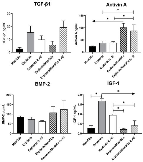 After co-culturing cartilage explants with MenSCs under IL-1β stimulation for 21 days, the medium was collected and secretion of the same growth factors—TGF-β1, activin A, BMP-2, and IGF-1—were studied, as in BMMSCs/MenSCs co-cultures (Figure 6).