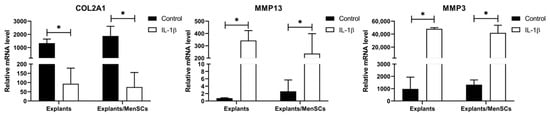 Collagen type II, MMP13, and MMP3 gene expression were analyzed in cartilage explants after co-culturing with MenSCs in order to evaluate MenSCs effects on chondrocyte metabolic gene expression. Even though the differences did not reach the level of statistical significance, MenSCs showed tendencies of upregulated COL2A1 expression and decreased MMPs under stimulation with IL-1β in co-cultures with explants (Figure 7). In our previous study, we co-cultivated human cartilage explants with adipose-derived MSCs and demonstrated a similar response of decreased MMP gene expression in chondrocytes after co-culturing with MSCs, suggesting beneficial paracrine factor action, promising developing novel therapeutic strategies based on MSC paracrine factors [].
