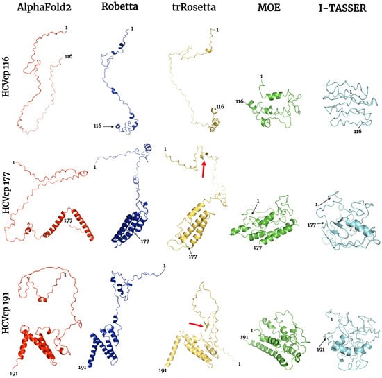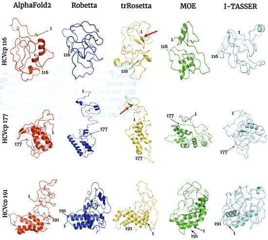 Tertiary structures of varying lengths of HCVcp (HCVcp 116, HCVcp 177, and HCVcp 191) predicted using AF2 (red), Robetta (blue), trRosetta (yellow), MOE (green), and I-TASSER (cyan). The positions of the first and last amino acids from the N-terminal of the protein are indicated. The red arrows indicate β-strands, which are also observed in the predicted secondary structures.