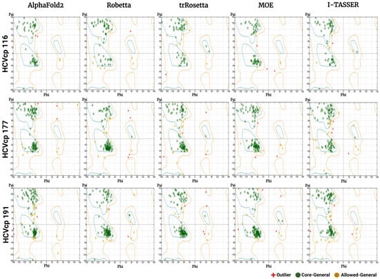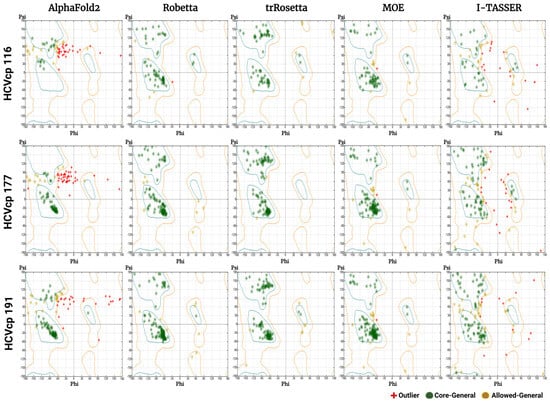Phi–psi plots of the refined HCVcp 116, HCVcp 177, and HCVcp 191 models. The models were constructed using AF2, Robetta, trRosetta, MOE, and I-TASSER and subsequently subjected to 200 ns MD simulations. The cyan outline corresponds to the most favored regions (conformations with no steric hindrance). The orange outline corresponds to the allowed regions. The regions outside the orange outline are disallowed regions (sterically forbidden regions).