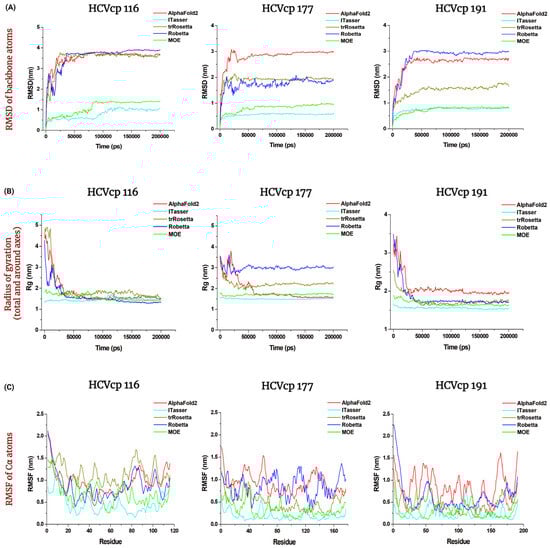 MD simulation trajectories of (A) RMSD of backbone atoms, (B) radius of gyration, and (C) RMSF of Cα atoms for the models of HCVcp 116, HCVcp 177, and HCVcp 191 during the 200 ns MD simulations. The red, blue, dark yellow, green, and cyan lines indicate the values for the models constructed using AF2, Robetta, trRosetta, MOE, and I-TASSER, respectively.