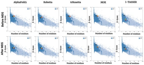 The Protein Structure Analysis (ProSA)-web [] is a tool for identifying potential errors in the 3D models of proteins. The ProSA-web z-score of a structure indicates the overall model quality and measures the deviation of the structure’s total energy from the energy distribution derived from random conformations. The overall quality score for a query structure analyzed using ProSA-web is displayed in a plot, which shows the scores of all available PDB protein structures determined experimentally through X-ray crystallography and NMR spectroscopy [,]. Protein structures with z-scores outside the range for typical protein characteristics are regarded as erroneous structures. The ProSA-web scores of the initial and refined models are presented in Figure 9. Even before MD simulations, all models had z-scores (Supplementary Table S3) within the range of scores typically observed for native proteins of similar size. After MD simulations, improvements were noted in the scores of the refined models (Supplementary Table S4). The z-scores of the refined models, except the HCVcp 116 model predicted using MOE, moved toward the center of the z-score range of native proteins of similar size.