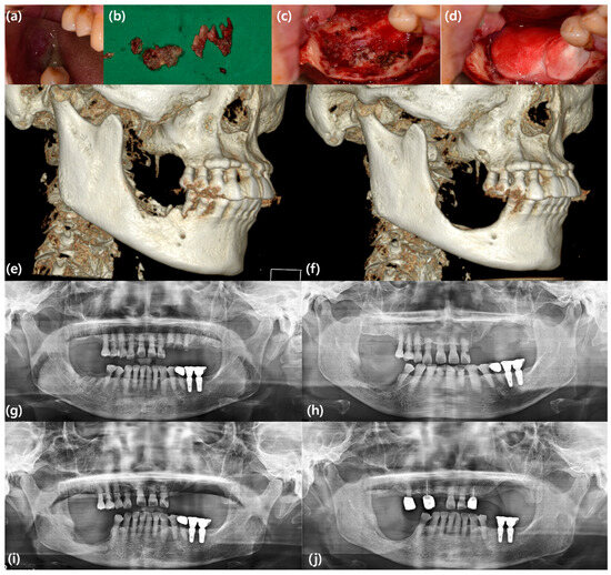A case represents an example of MRONJ treatment using rhBMP-2/ACS. A 68-year-old female patient with MRONJ on the mandibular right posterior area underwent sequestrectomy, surgical extraction of the mandibular right second premolar, and application of rhBMP-2/ACS. She showed no significant symptoms associated with rhBMP-2 other than usual postoperative edema. Although sufficient bone regeneration was not achieved at the surgical site, she presented uneventful healing and underwent the fabrication of removable partial dentures. (a) Clinical photo showing denuded bone and pus discharge due to MRONJ; (b) clinical photo showing removed sequestrum and granulation tissue; (c) intraoperative clinical photo showing the defect after sequestrectomy and surgical extraction; (d) intraoperative clinical photo showing the defect filled with rhBMP-2/ACS; (e) preoperative three-dimension (3D)-reconstructed CBCT image; (f) 3D-reconstructed CBCT image six months after surgery; (g) preoperative panoramic view; (h) immediate postoperative panoramic view; (i) panoramic view three months after surgery; (j) panoramic view two years after surgery.