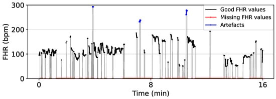 - Artefact RemovalA typical baseline heart rate of a normal fetus varies between 110 bpm and 160 bpm, and accelerations or decelerations occur when amplitude varies 15 bpm above or below the baseline lasting for more than 15 s respectively [11]. In the artefact removal step, values below 50 bpm and above 200 bpm are typically considered outliers and removed [36]. In some studies, consecutive missing values of more than 15 s (long gaps) are removed from the analysis [36,40,86]. For others, when the difference between two adjacent FHR values exceeds 25 bpm, the corresponding signal segment from the previous FHR value to the next stable segment is considered unstable and removed [45,85]. A stable segment is a signal segment with five consecutive FHR values having a difference of less than 10 bpm between them [31].