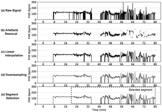 - DownsamplingA typical fetal heart beats less than 3 times per second (<180 bpm), making some data of the original FHR signals sampled at 4 Hz redundant [46,87]. Therefore, in this step, the FHR signal is sometimes downsampled to reduce the computational complexity and memory needed to process the input signals. For example, only 900 values are required to represent a 60 min FHR signal at 0.25 Hz, compared to the 14,400 values required for the same signal at 4 Hz.