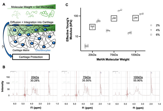 Tissue-infiltrating methacrylated hyaluronic acid hydrogel system. (A) Gel mechanics and diffusion of biomaterial into the cartilage matrix are molecular-weight dependent, and their influence on cartilage protection is unclear. (B) NMR spectroscopy of MeHA polymers (20, 75, 100 kDa) with calculated degree of methacrylation. (C) Effective Young’s Modulus of MeHA gels of different MW (20, 75, 100 kDa) and concentrations (2, 4, 6% w/v). Square boxes highlight 4% w/v formulations utilized for the remainder of studies. Each point represents its own fabricated gel, with ~25 indentations per gel. n = 2–5 gels per group.