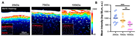 All three MW MeHA’s diffused into and integrated within cartilage tissue, with the 20 kDa HA showing the greatest intensity (Figure 2A). The quantification of intensity in the top 50 µm demonstrated a significant trend of greater material integration with lower molecular weight (Figure 2B), with the 20 kDa MeHA (985.2 ± 346.7 arbitrary units (a.u.)) showing greater than twice the intensity than the 100 kDa MeHA (473.2 ± 241.3 a.u.).