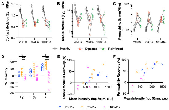 The digestion of cartilage explants with collagenase demonstrated consistent reductions in contact and tensile modulus and increased the permeability in all three groups of explants. Overall, the 20 kDa and 75 kDa MeHA gels provided a partial restoration of these properties, but the 100 kDa MeHA gel provided no benefit (and in some cases, it led to worsening). For contact modulus specifically (Figure 3A), the 20 kDa and 75 kDa gels led to average increases of 95 kPa (13.7% recovery) and 145 kPa (21.6% recovery), respectively, over previously digested values. The recovery of tensile modulus (Figure 3B) and permeability (Figure 3C) were much more apparent, but not for the 100 kDa MeHA gel. The % recoveries are highlighted in Figure 3D; the 20 kDa and 75 kDa MeHA gels led to 64.8% and 75.9% recoveries in permeability, respectively, both significantly greater than the 100 kDa gel (−28.7% recovery). When the % Recovery in tensile modulus and permeability were plotted against the MeHA intensity in the top 50 µm (Figure 3E,F, respectively), a clear positive relationship was observed.