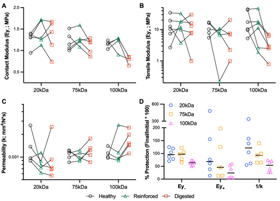 MeHA fortification before digestion was also performed to examine the protective ability of the gel. Overall, this Protection study (Figure 4) resulted in greater variability than the Restoration study. Looking specifically at the % protection in each of the variables (Figure 4D) highlights that the 20 kDa and 75 kDa provide superior protective capacity compared to the 100 kDa gel, especially with regard to contact modulus and permeability.