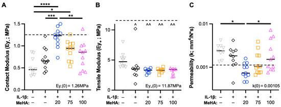 Cartilage explant mechanical properties during IL-1β degenerative culture. (A) Contact modulus, (B) tensile modulus, and (C) permeability of explants after two weeks of culture. n = 11 per group from 3 donors. Dashed line represents values from time-zero testing (inset text gives numerical value). *, **, ***, and **** represent p < 0.05, 0.01, 0.001, and 0.0001, respectively. ^ and ^^ represent p < 0.05 and 0.01, respectively, relative to the Ctl group.