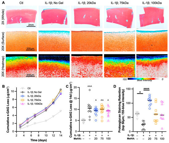 Integral to cartilage health is the retention of proteoglycans, which comprise s-GAGs. An analysis of s-GAG release into the media in a temporal (Figure 6B) and cumulative fashion (Figure 6C) showed that all explants treated with IL-1β (including MeHA gel groups) showed more than double the release of s-GAG into the media than Ctl explants. However, given the emphasis on media and MeHA gel application on the articular surface, spatial s-GAG analysis was required. Safranin O staining is a key hallmark of healthy cartilage and chondrogenesis, and loss of staining is typically indicative of a degenerative state. Upon visualization of entire explants (Figure 6A—top row), immediate differences between groups were not observed. However, higher-resolution imaging of the articular surface showed that (1) IL-1β culture led to the depth-dependent loss of proteoglycans, (2) 20 kDa MeHA gel application led to no observable loss of Safranin O staining, and (3) 75 kDa and 100 kDa MeHA gel application showed slight and moderate loss of Safranin O staining, respectively (Figure 6A—middle and bottom rows). This was confirmed by quantification of the inverse of the blue intensity (Figure 6D), which utilizes a lack of visualized Fast Green as a sign of proteoglycan retention. The 20 kDa MeHA gel application consistently facilitated s-GAG retention, whereas the 75 kDa and 100 kDa MeHA gels exhibited a large range of protection from lost Safranin O staining.