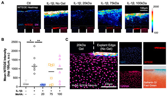 Proteoglycan breakdown (NITEGE) following IL-1β degenerative culture. (A) Heatmap of NITEGE staining. Insets are DAPI (blue), NITEGE (red), and CellMask (magenta). Scale bar represents 100 μm. (B) Quantification of mean NITEGE pixel intensity in the top 100 μm. n = 6 per group. * and ** represent p < 0.05 and 0.01, respectively. (C) NITEGE heatmap at explant edge, with a clear border between gel-containing and non-gel-containing regions. DAPI, NITEGE, CellMask, and Safranin O/Fast Green staining images. Scale bar represents 100 μm.